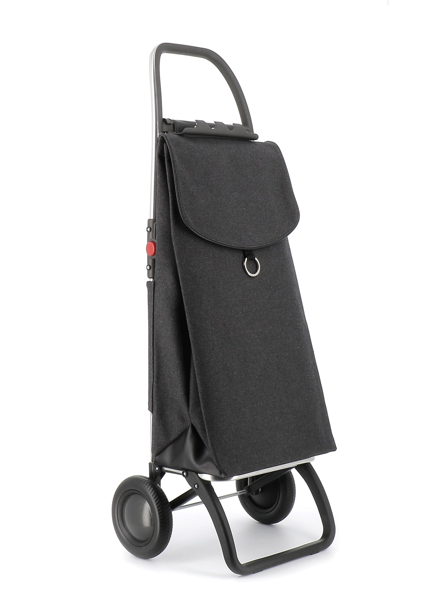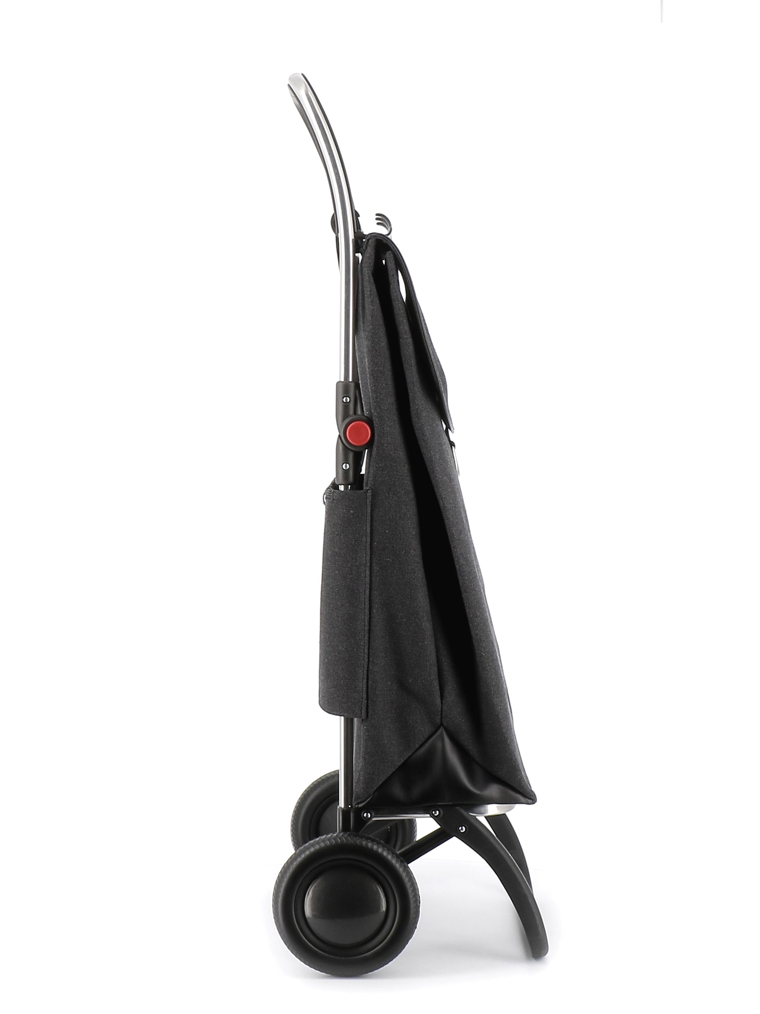 Einkaufstrolley aus Aluminium mit 2 Rädern. Ausgestattet mit Haken zum Anhängen an den Einkaufswagen im Supermarkt. Tasche mit metallverziertem Überschlag, Innentasche und Reißverschlusstasche an der Rückseite. Gewebe hergestellt aus 100% recycelten Materialien.
