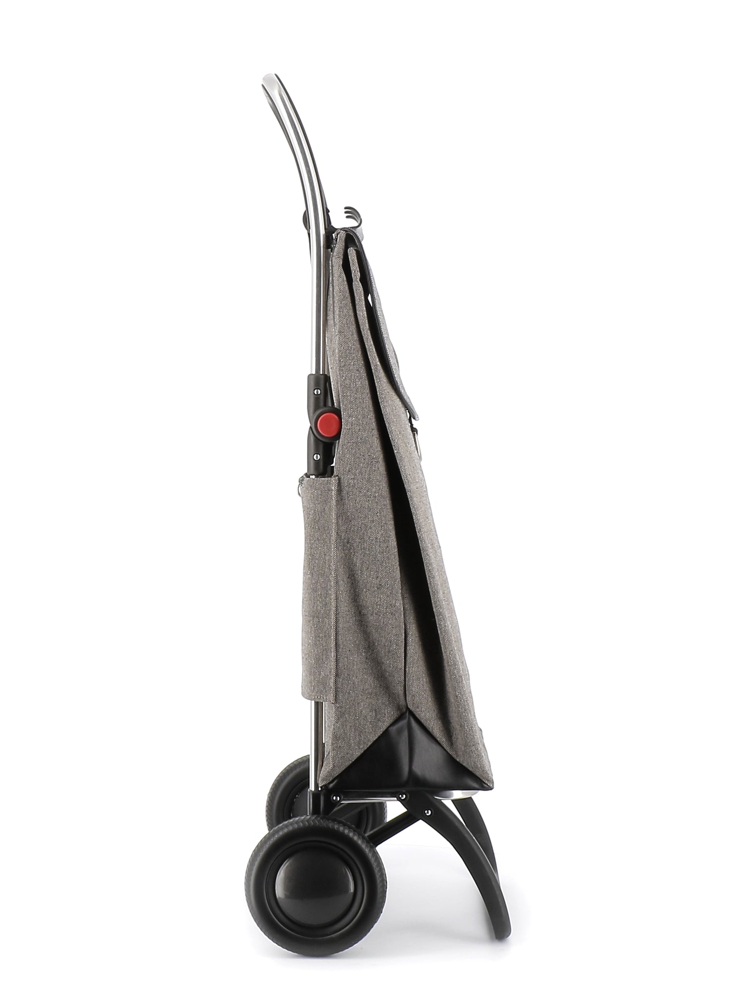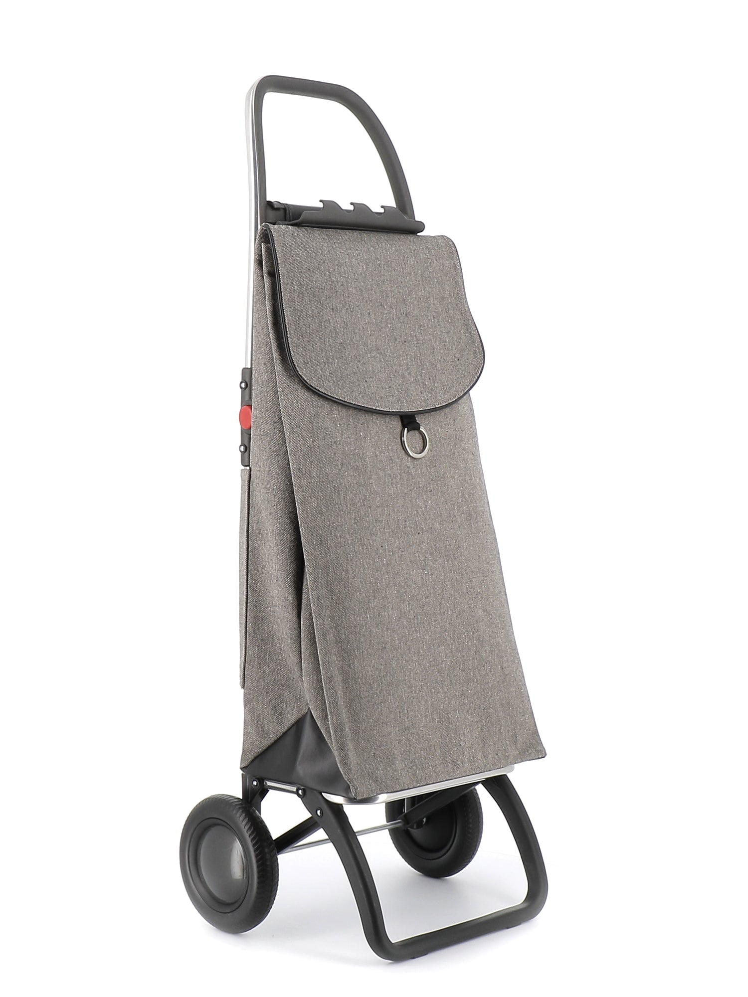 Einkaufstrolley aus Aluminium mit 2 Rädern. Ausgestattet mit Haken zum Anhängen an den Einkaufswagen im Supermarkt. Tasche mit metallverziertem Überschlag, Innentasche und Reißverschlusstasche an der Rückseite. Gewebe hergestellt aus 100% recycelten Materialien.